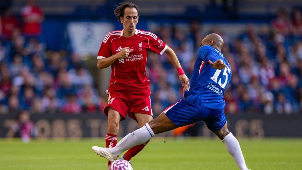 The tempo stayed high, with both sides playing at an impressive level for a legends’ fixture. Pepe Reina reminded fans of his reflexes with a fine save to keep out Diego Costa, who was later booked after a fiery exchange with Martin Skrtel following a tough tackle. The first half ended goalless, but it was packed with quality and competitiveness from two squads full of experience and pride.